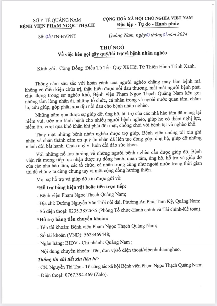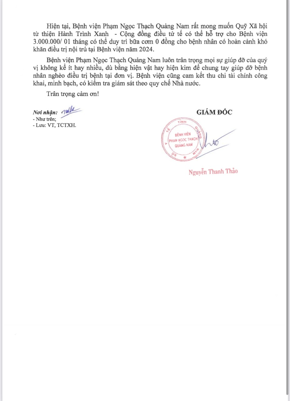 Bệnh viện rất mong nhận được sự giúp đỡ của Cộng Đồng Điều Tử Tế và Quý MTQ để cải thiện chất lượng bữa ăn cho bệnh nhân. Mỗi tháng 3.000.000 đồng, nhờ đó bệnh nhân yên tâm điều trị, ổn định sức khỏe cho bản thân và tránh lây lan cho cộng đồng.