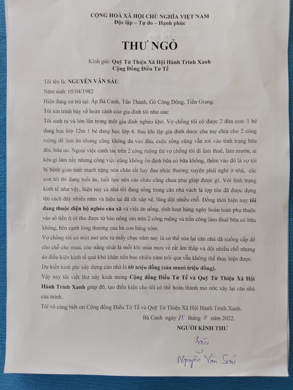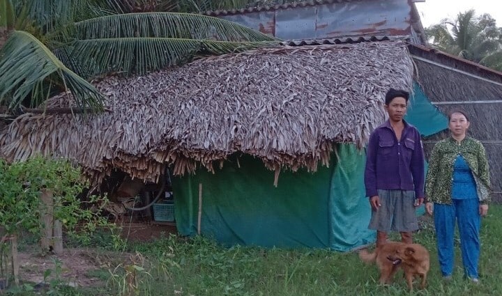 -Với tình trạng kinh tế như vậy, hiện nay cả nhà anh chị đang sống trong căn nhà vách lá lợp tôn đã được dựng lên cách đây nhiều năm và hiện tại đã rất xập xệ, lũng dột nhiều chỗ. Vợ chồng anh chị có một mơ ước từ mấy chục năm nay là có thể sửa lại căn nhà đã xuống cấp để cho chỗ che mưa, che nắng nhất là mỗi khi mùa mưa về rất ẩm thấp, ngập nước và dột nhiều chỗ nhưng do điều kiện kinh tế quá khó khăn, với thu thập ít ỏi từ bán nông sản canh tác trên hai mẫu ruộng, cộng với tiền công đi làm mướn ngày có, ngày không thì việc chạy ăn từng bữa cộng với việc lo cho các con ăn học đã là rất khó khăn với gia đình, nên bao nhiêu năm trôi qua vẫn không thể thực hiện được. Với tầm lòng tương thân, tương ái.