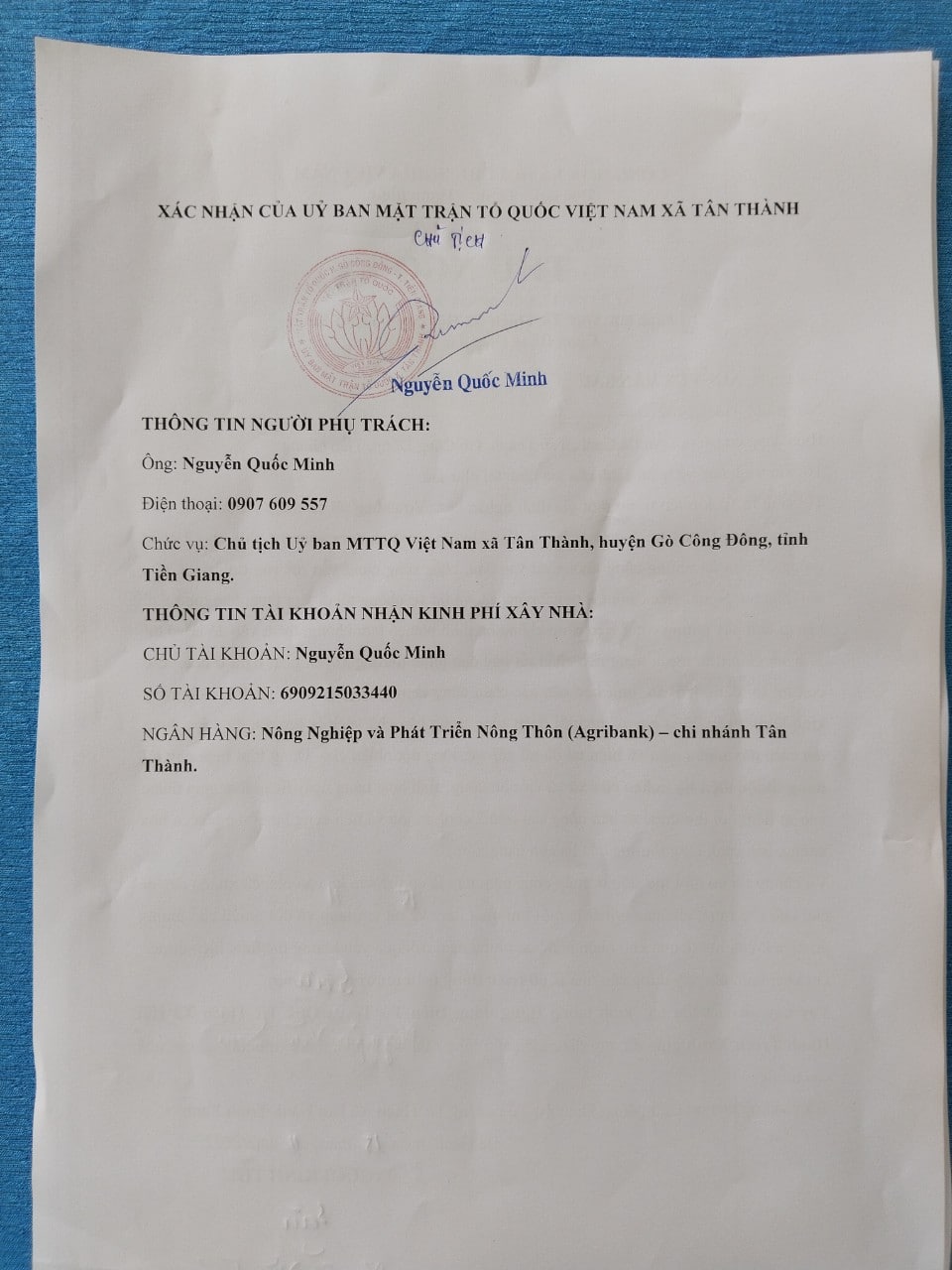 -Thông tin liên hệ: Ông Nguyễn Quốc Minh – 0907 609 557 Chức vụ: Chủ tịch Uỷ ban MTTQ Việt Nam xã Tân Thành, huyện Gò Công Đông, tỉnh Tiền Giang.