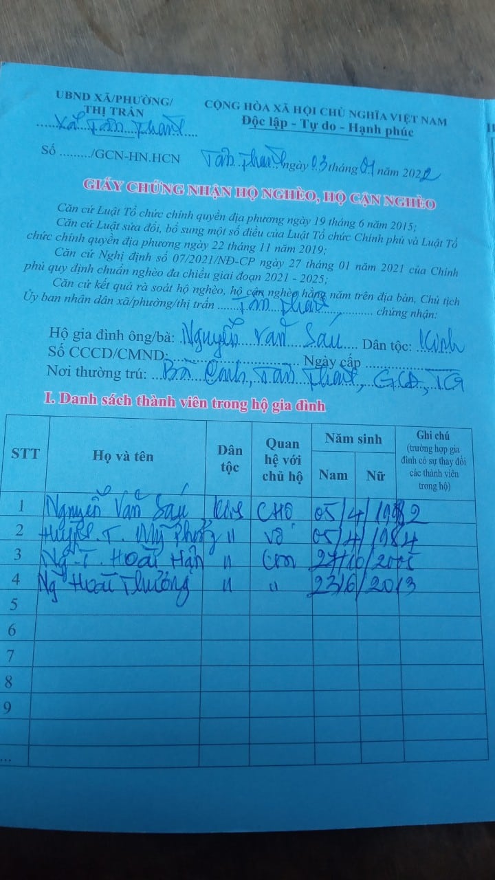 Gia đình anh Nguyễn Văn Sáu (05/04/1982) và chị Huỳnh Thị Mỹ Phương (05/04/1984), hiện đang là hộ nghèo tại: Ấp Bà Canh, Tân Thành, Gò Công Đông, Tiền Giang.