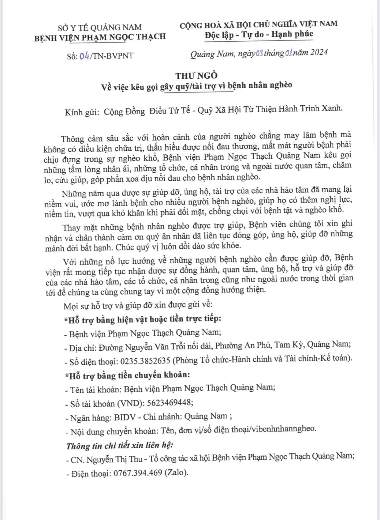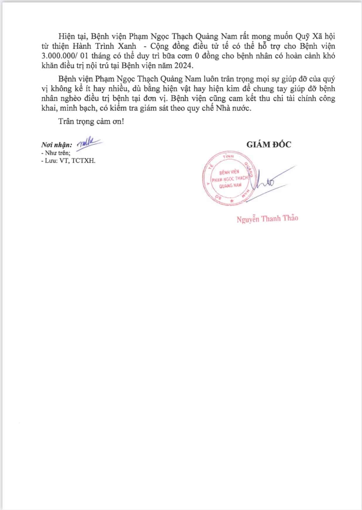 Bệnh viện rất mong nhận được sự giúp đỡ của Cộng Đồng Điều Tử Tế và Quý MTQ để cải thiện chất lượng bữa ăn cho bệnh nhân. Mỗi tháng 3.000.000 đồng, nhờ đó bệnh nhân yên tâm điều trị, ổn định sức khỏe cho bản thân và tránh lây lan cho cộng đồng.